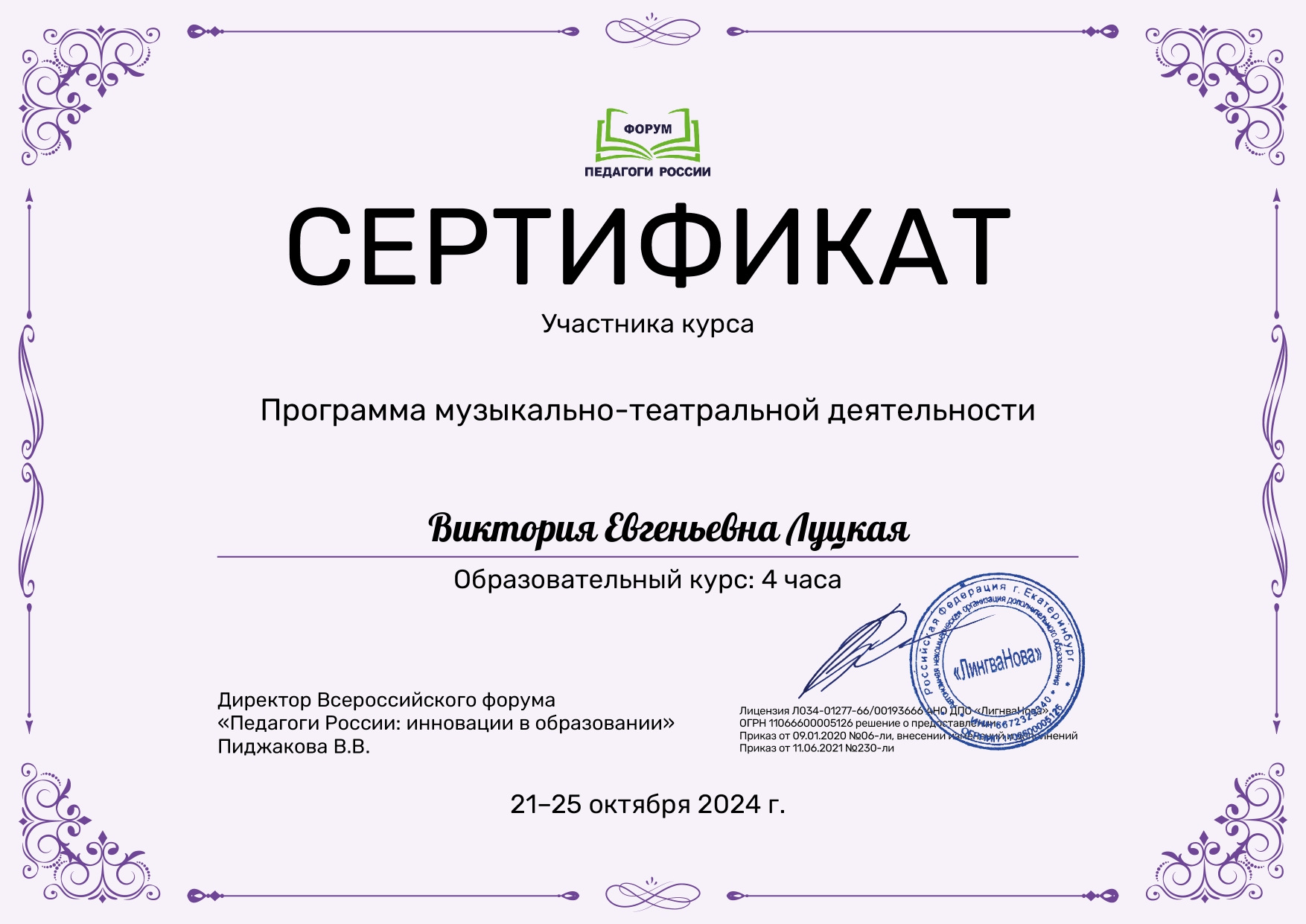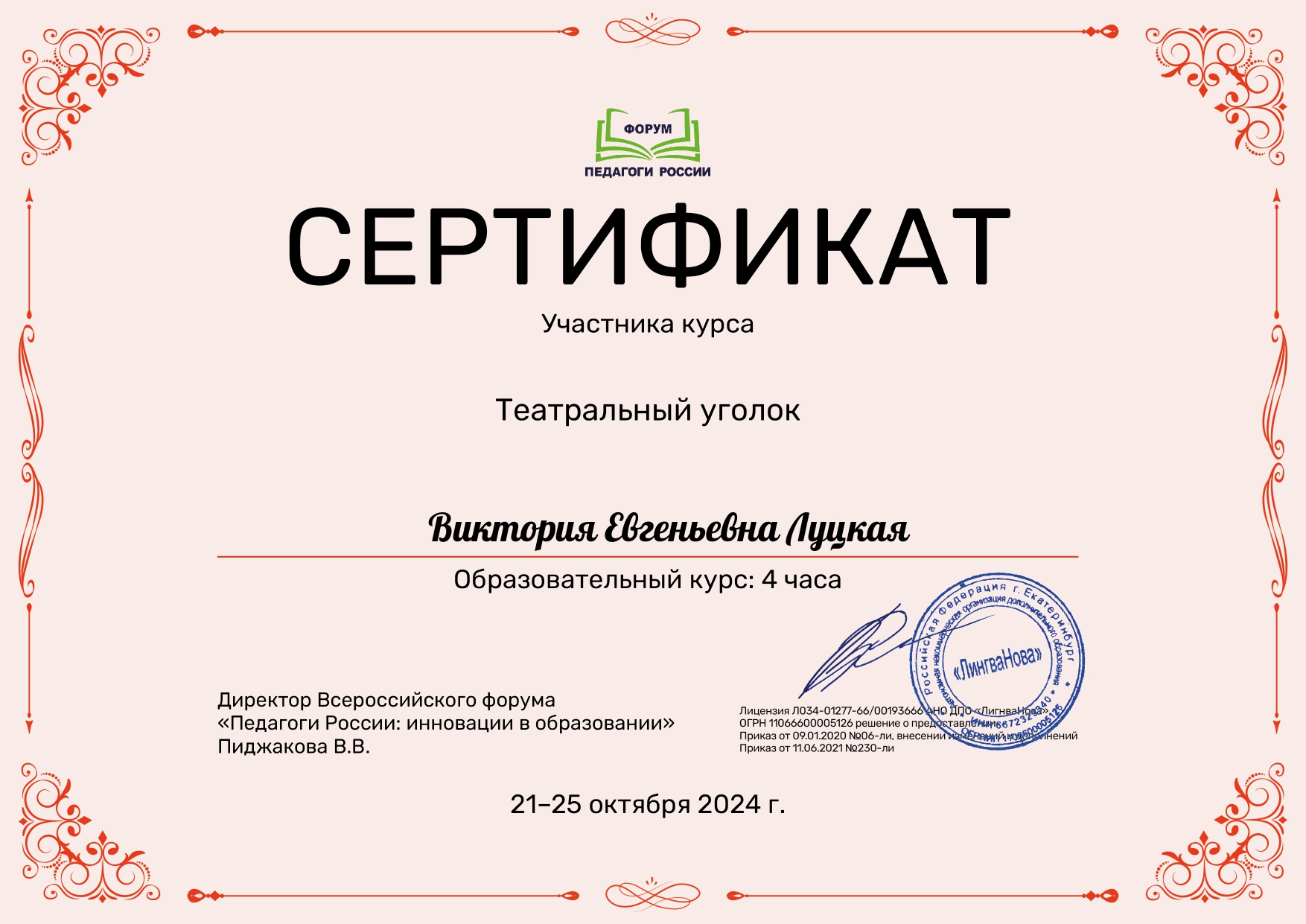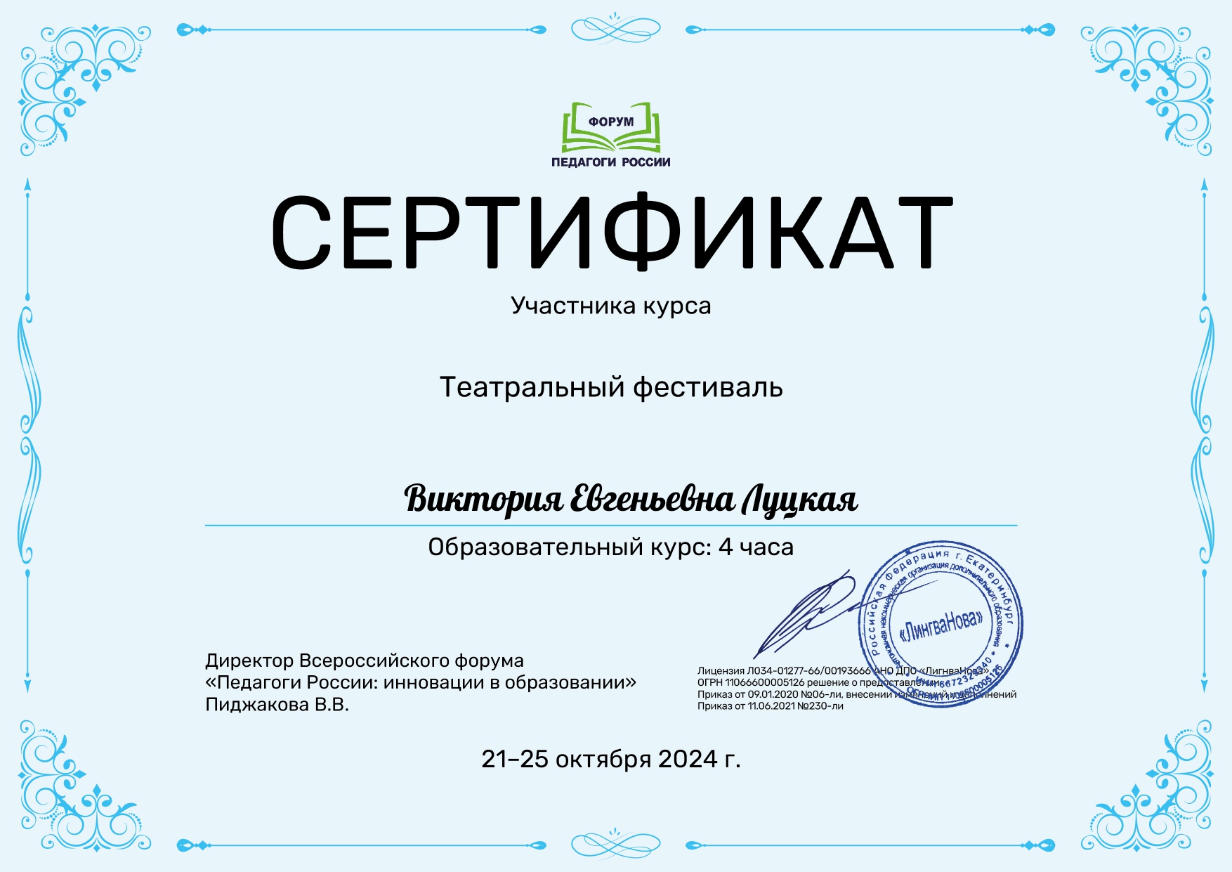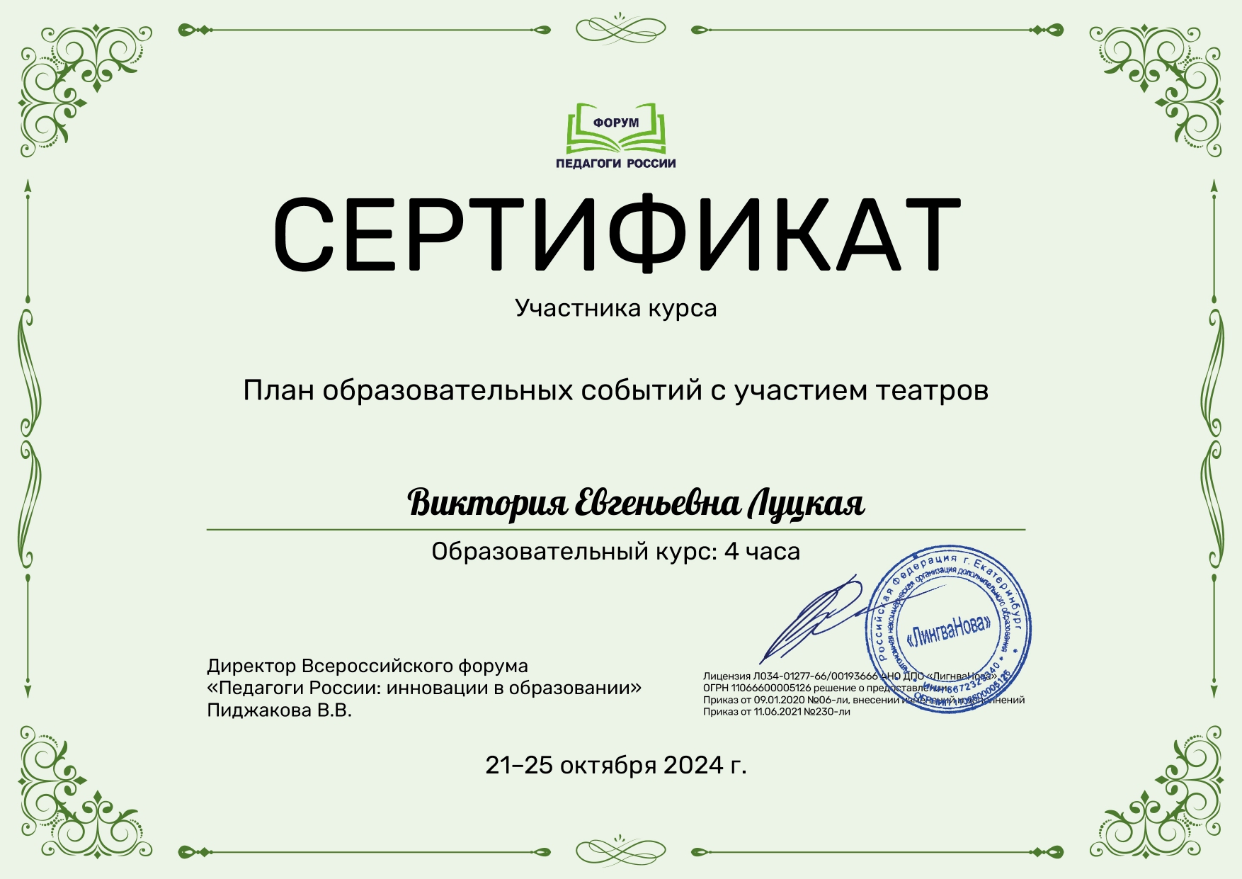 Сертификат участника курса Школьный театр и театр в ДОО.Образовательный курс 4 часа АНО ДПО Лингнова 25.10.2024