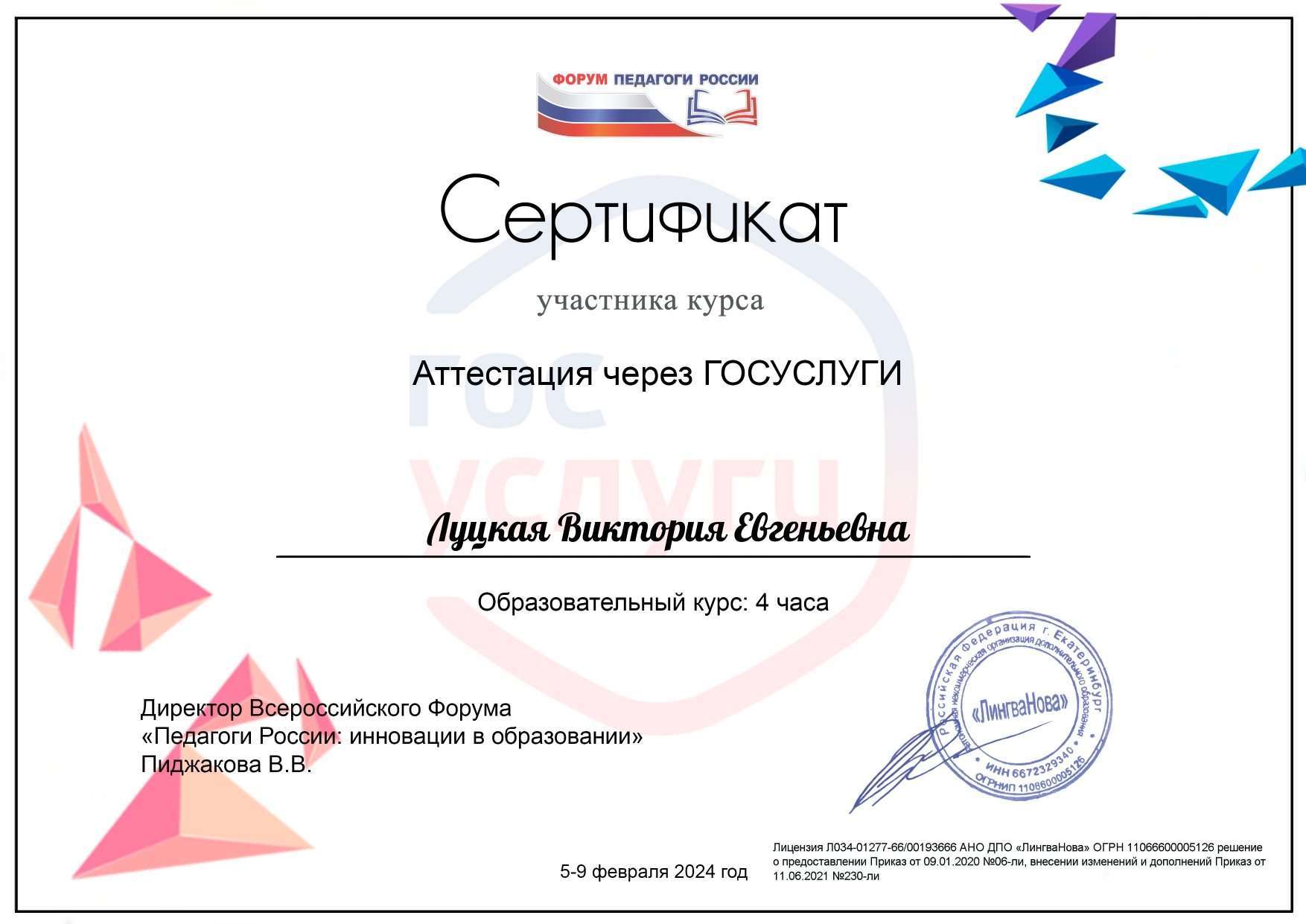 Сертификат участника курса " Аттестация через ГОСУСЛУГИ" АНО ДПО " ЛингНова" 4 ч. февраль 2024