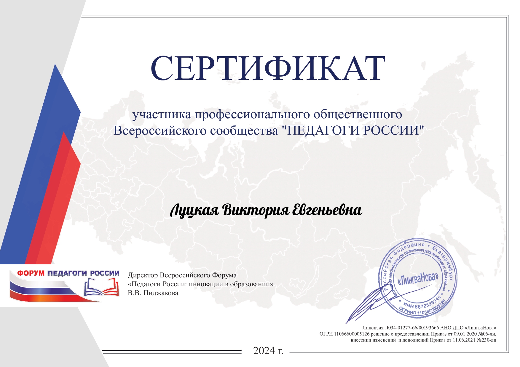 Сертификат участника профессионального общественного всероссийского сообщества " Педагоги России" 2024