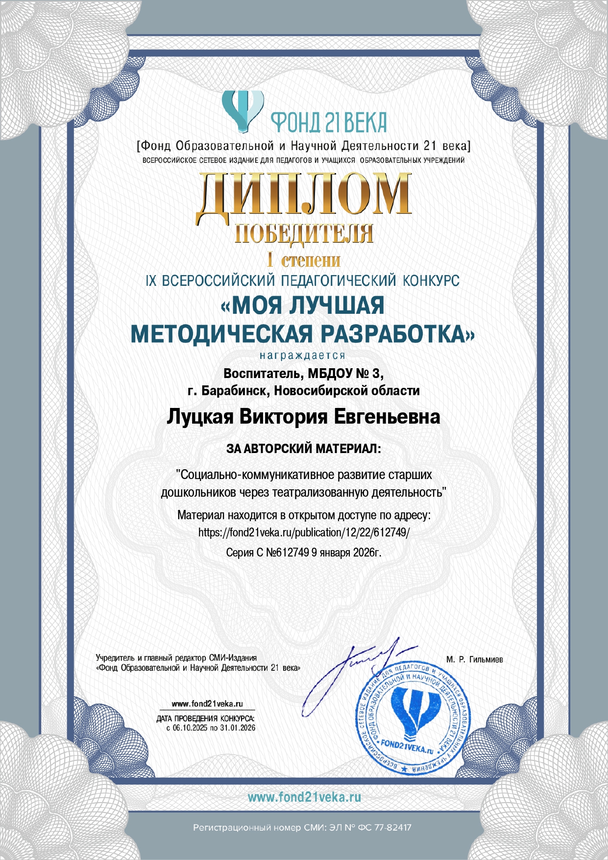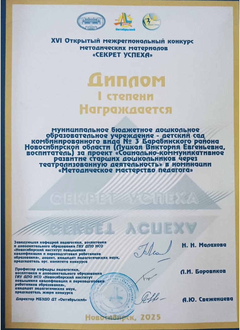 2025г. XVI Открытый межрегиональный конкурс методических материалов"Секрет успеха".Номинация "Методическое мастерство педагога"Диплом 1 степени.