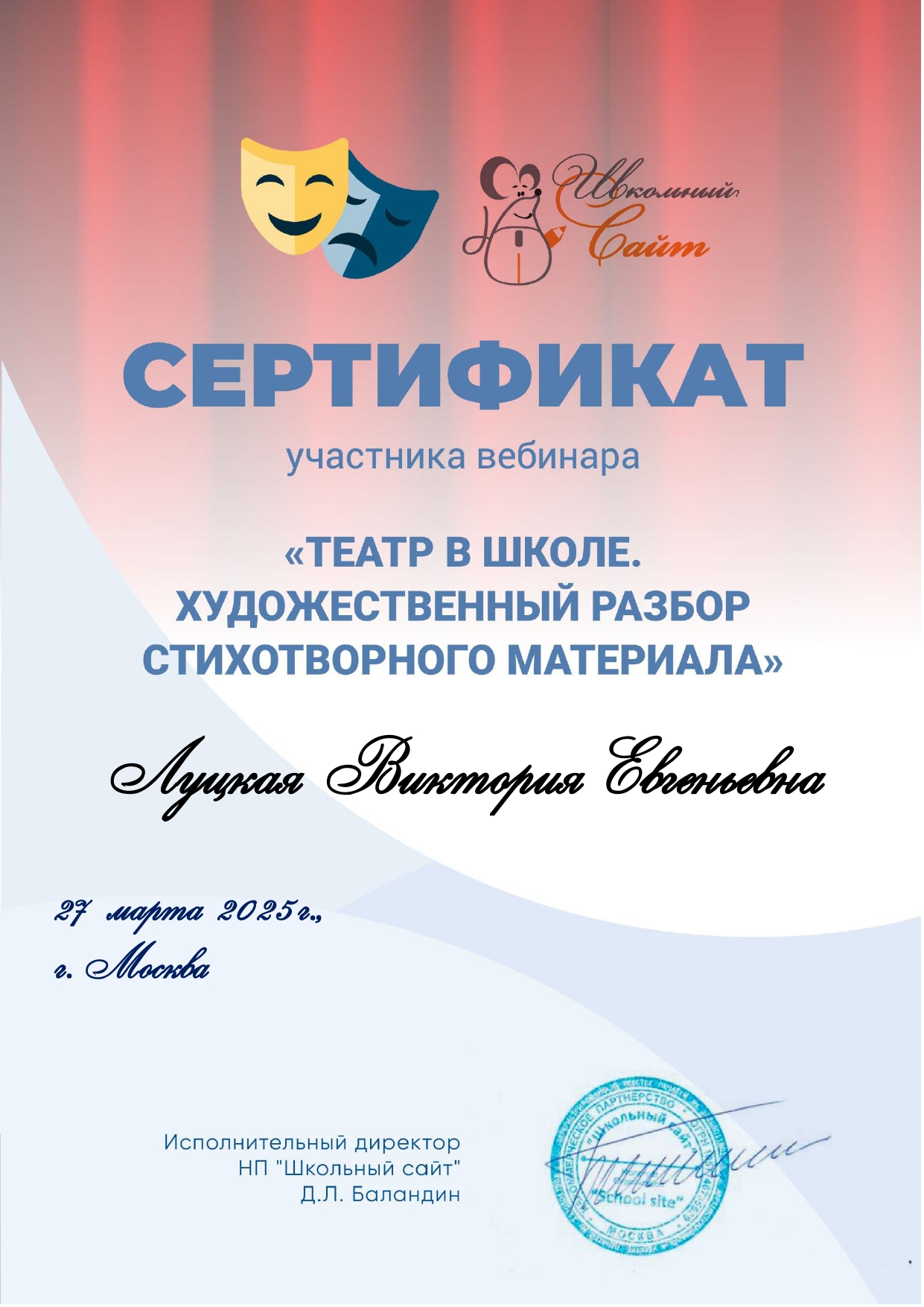 Сертификат участника вебинара "Театр в школе.Художественный разбор стихотворного материала" 27.03.2025 НП "Школьный сайт"