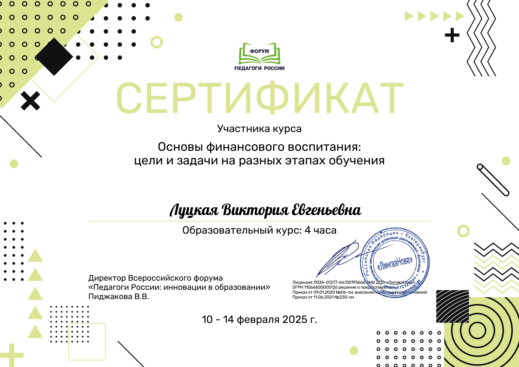 Сертификат участника курса Всероссийский форум "Педагоги России" АНО ДПО " ЛингНова""Основы финансового воспитания: Цели и задачи на разных этапах обучения" 4 часа 14 февраля 2025г