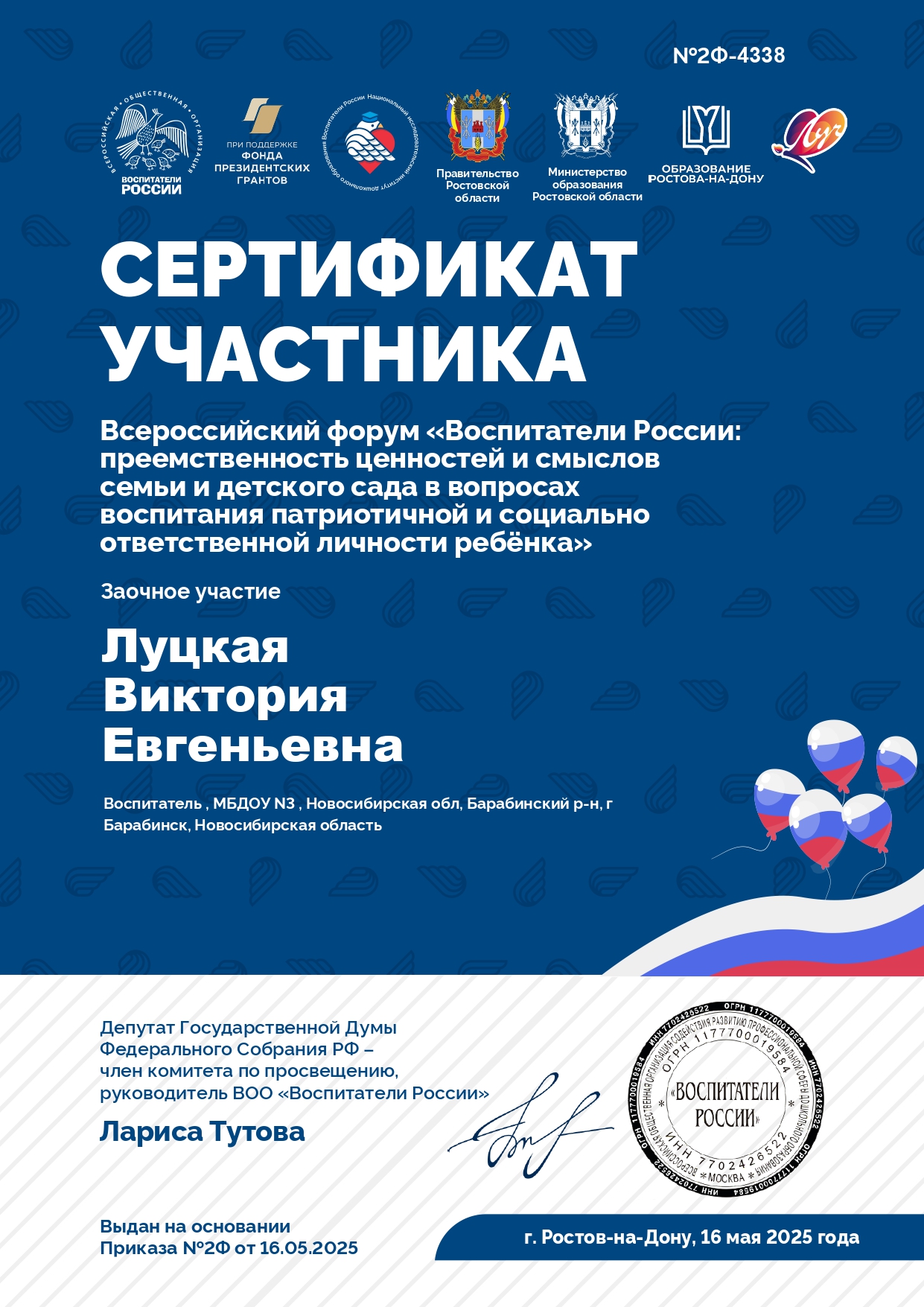 Сертификат участника Всероссийский форум "Воспитатели России: преемственность ценностей и смыслов семьи и детского сада в вопросах воспитания патриотичной и социально ответственной личности ребенка" 2025 г