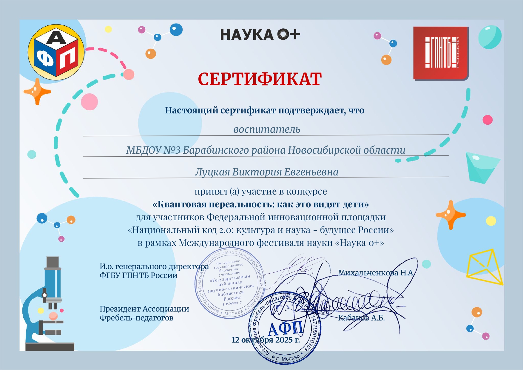 Сертификат участия в конкурсе "Квантовая нереальность: как это видят дети" для участников ФИП " Национальный код 2.0: культура и наука -будущее России" в рамках Международного фестиваля "Наука 0+" 12.10.2025