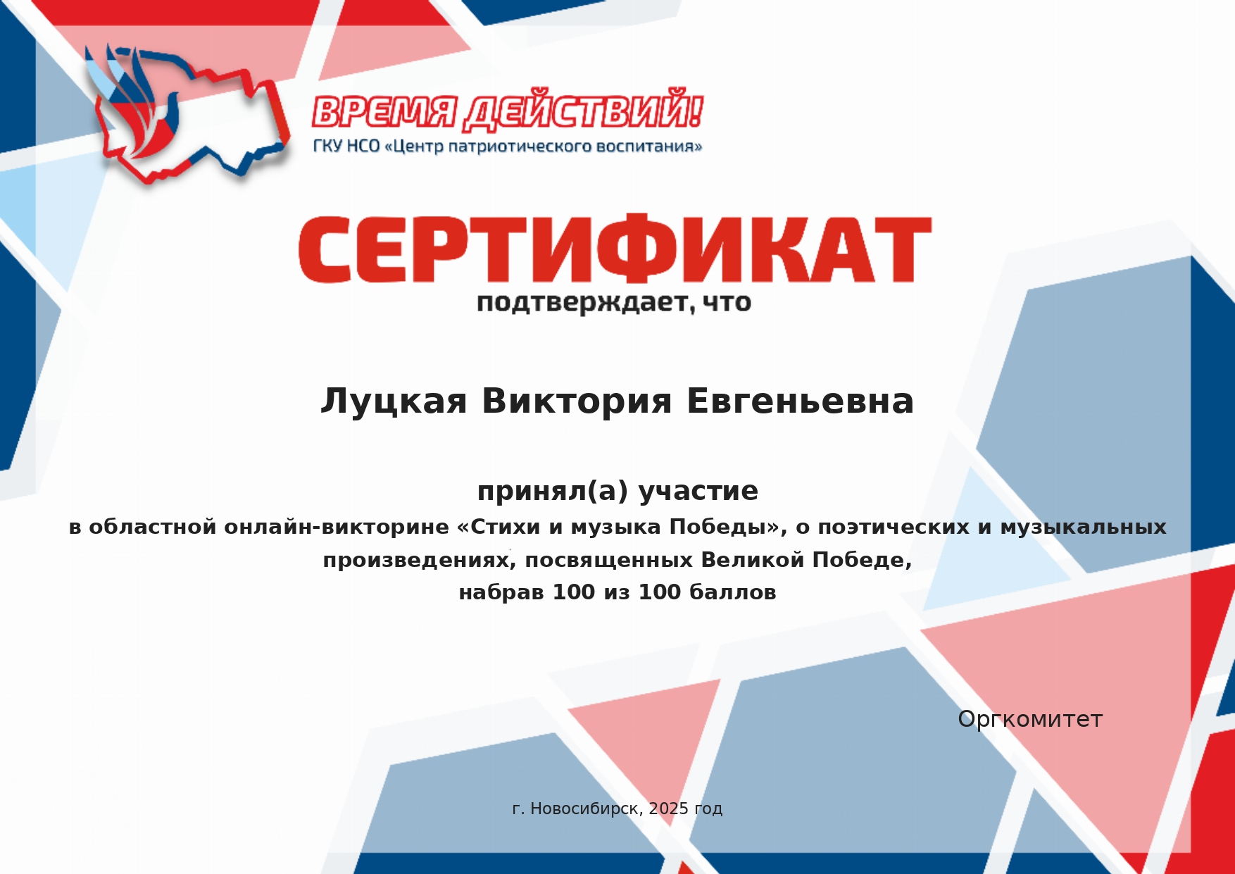 Сертификат участника Областная онлайн- викторина " Стихи и музыка победы", о поэтических и музыкальных произведениях, посвященных великой победе.2025