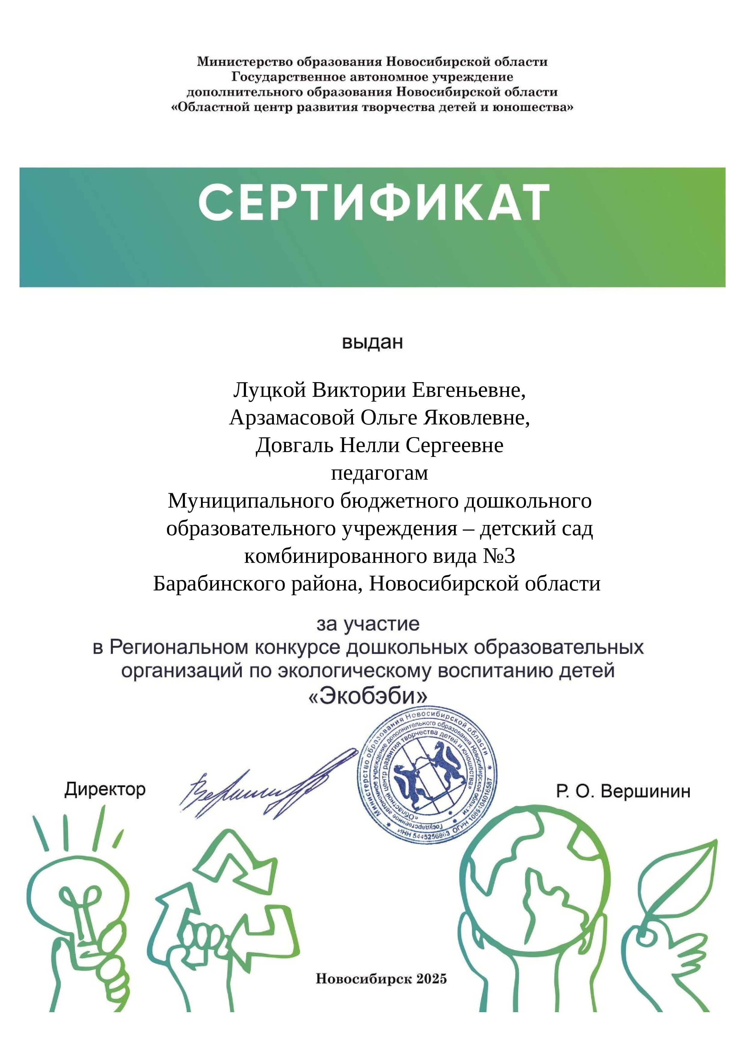 Сертификат за участие в Региональном конкурсе дошкольных образовательных организаций по экологическому воспитанию детей "Экобэби"
