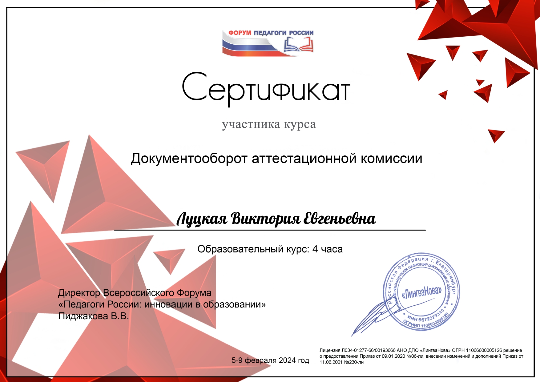 Сертификат участника курса " Документооборот аттестационной комиссии " ЛингНова" 4 ч. февраль 2024