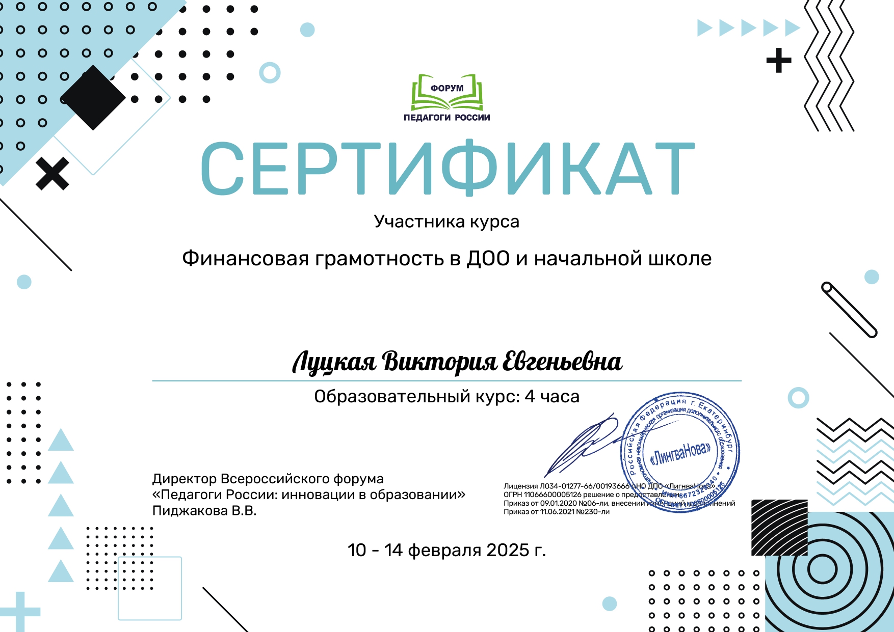 Сертификат участника курса Всероссийский форум " Педагоги Росии" АНО ДПО "ЛингНова"Финансовая грамотность в ДОО и начальной школе. ок 4 часа 14.02.2025